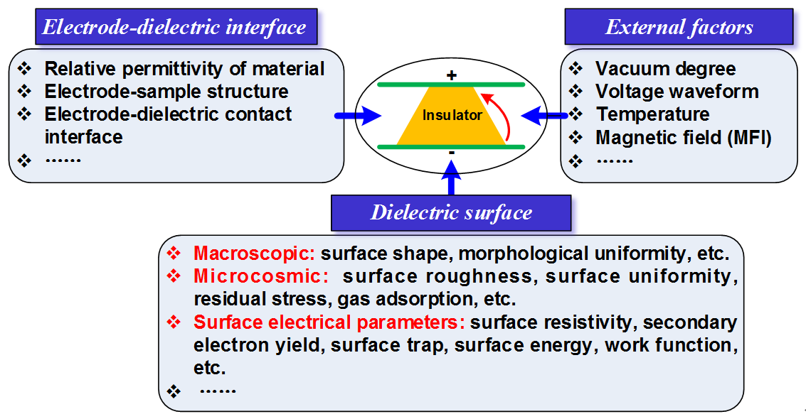 真空沿面闪络的影响因素:该论文认为真空沿面闪络现象的物理过程非常复杂,其影响因素众多,研究中大多通过影响因素的考察来深入认识闪络现象及其机理,并结合影响因素的控制来探索提高沿面耐电强度的方法。综合分析当前的相关研究,该论文认为影响真空沿面闪络的主要因素可以归纳为三大方面:电极-介质界面因素、介质表面因素和外在因素,如图6所示。
