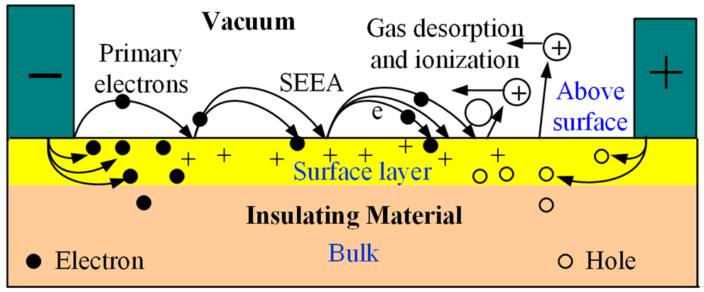 真空沿面闪络的机理:关于闪络的主流理论模型有二次电子发射雪崩(SEEA)模型和电子触发的极化松弛(ETPR)模型。目前,学者对SEEA模型更为认可,该模型强调从阴极三结合点处(Cathode Triple Junction, CTJ)处发射的初始电子碰撞绝缘介质表面引起二次电子发射,继而导致电子崩,产生表面吸附气体解吸附、电离雪崩而引发贯通性击穿现象,如图7所示。