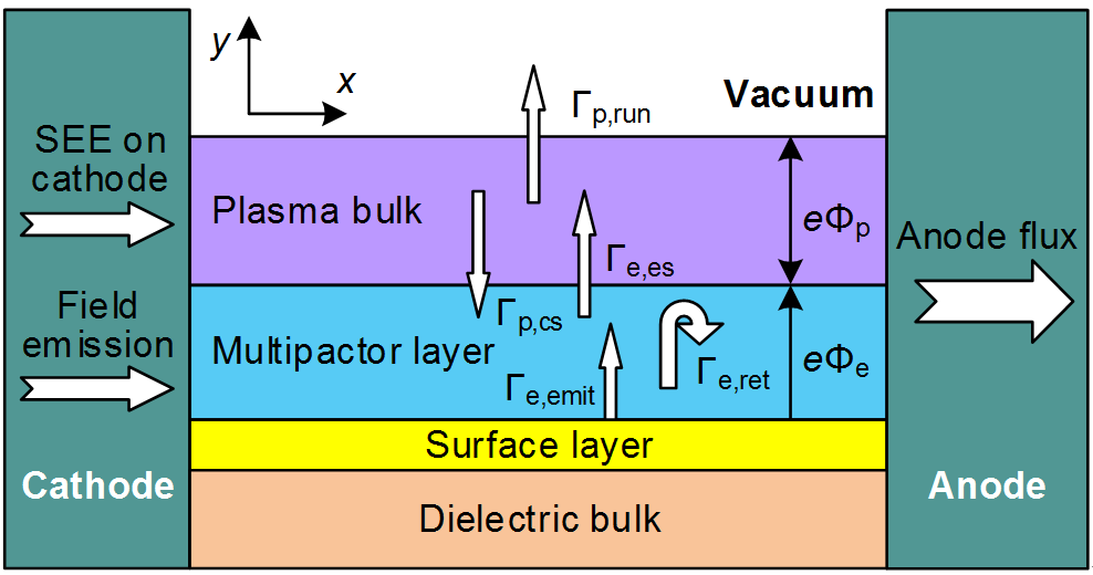 近日,作者课题组也对真空沿面闪络问题进行了基于SEEA理论的PIC仿真和基于等离子体动力学的动力学仿真,模拟了闪络击穿阶段的等离子体放电发展过程,并阐释了放电模式转换理论。基于此建立了二次电子崩-等离子体双层模型,是首个真空沿面击穿动力学模型,进一步更新了SEEA理论,如图9所示。关于该模型的细节,可参考我们前期的推送文章《真空沿面闪络击穿阶段的物理建模与理论研究》。