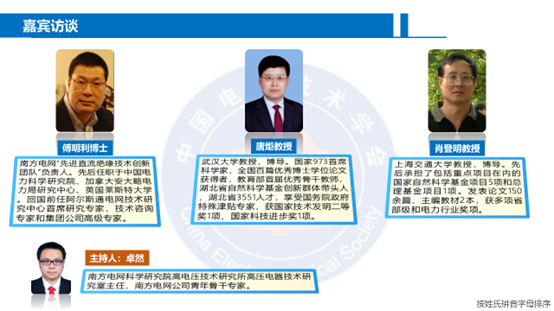 在嘉宾访谈环节,邀请南方电网“先进直流绝缘技术创新团队”负责人傅明利博士、武汉大学电气与自动化学院院长唐炬教授、上海交通大学肖登明教授分别回答线上参与者的提问。几位专家针对当前环保气体研究现状、难点以及未来发展趋势做出了总结。