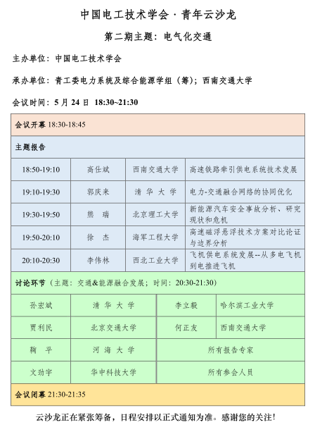 中国电工技术学会青年工作委员会计划联合组织“中国电工技术学会青年云沙龙”系列视频会议。青年云沙龙于5月10开始,每两周举办一期,时间一般为周日19:00-22:00。青年云沙龙的模式分为青年学者报告会和资深学者讲堂2种。其中,青年学者报告会主要围绕学术前沿,以青年学者报告和交流为主,也可邀请资深学者参会点评;资深学者讲堂主要邀请本学科及相关学科的权威专家开讲,聚焦学术热点,针对青年学者成长、成才过程中的相关问题,为青年学者指点迷津。
