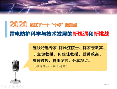 会议的第二阶段通过连线特邀嘉宾,就未来十年雷电防护科学与技术研究发展面临的机遇和挑战进行了主题访谈。特邀嘉宾从面向国家重大需求、行业政策趋势、未来研究热点等方面与青年学者进行了交流和指导。陈院士鼓励青年学者坚持基础研究,聚焦先进的放电机理的诊断方法和装置研发,争取原创突破。陈家宏教高通过回顾雷电防护研究的历程,建议青年学者应面向电气化交通、新能源等新领域雷电预警和防护的迫切需求开展攻关。丁立健院长分析了气象领域和电工领域研究雷电防护的特色和优势,分享了合肥工业大学在飞行器雷电防护研究方面的进展情况,建议未来雷电防护应关注国防重点领域的相关需求。何俊佳教授认为雷电防护研究具有长期性和艰巨性,勉励从事本领域的青年学者要脚踏实地、坚持不懈,并树立多学科融合研究的思路,重点发展放电机理的观测新手段。殷禹所长分享了近年来电力系统雷电防护进展的情况,指出目前在发展智慧能源互联网背景下配电网一、二次设备融合对于雷电防护提出了新的挑战。曾嵘教授从科研选题的角度,认为未来雷电防护研究一方面应聚焦放电微观机理,坚持攻关,同时在宏观角度应面向重点解决行业的重大需求,发展新的雷电预警和防护技术。会议的最后,陈家宏教高对研讨会进行了总结发言,号召倡议更多的青年学子投身雷电防护的基础研究。