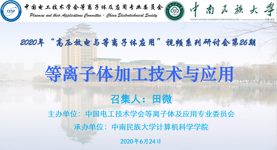 2020年6月24日下午14:30-17:20,中国电工技术学会等离子体及应用专业委员会“高压放电与等离子体应用”系列视频研讨会(第26期)成功召开。会议主题是“等离子体加工技术与应用”,会议由中南民族大学计算机科学学院承办。本次会议采用腾讯视频会议和哔哩哔哩视频直播相结合的形式,得到了来自国内外高校及科研院所的专家和科研工作者的大力支持,共有200余人加入会议室交流。会议由中南民族大学田微教授主持。