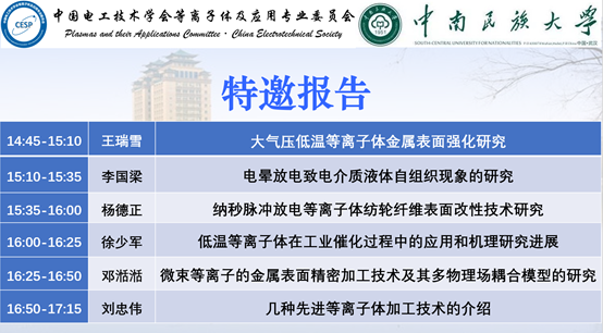 目前科学与工程技术的发展对新材料、新结构、新工艺的要求日益迫切,等离子体加工技术作为一种不断发展的新型加工技术,其应用也越来越广泛,涉及到多个学科领域,并都取得了较大的进展。本次会议的组织得到了中南民族大学计算机科学学院、等离子体科学和能源转化北京市国际科技合作基地,以及学术期刊《电工技术学报》、《高电压技术》、《High Voltage》、《Plasma Science and Technology》编辑部等多家单位的支持。会议邀请到了华中科技大学卢新培教授、中科院电工所邵涛研究员和中南民族大学覃俊教授作为特邀嘉宾;并邀请北京化工大学王瑞雪教授、中南民族大学李国梁博士、大连理工大学杨德正教授、英国卡迪夫大学徐少军博士、华中科技大学邓湉湉博士、北京印刷学院刘忠伟教授六位专家学者做特邀报告。内容涉及等离子体技术在机械加工、材料改性、工业催化等加工技术上的研究与应用。
