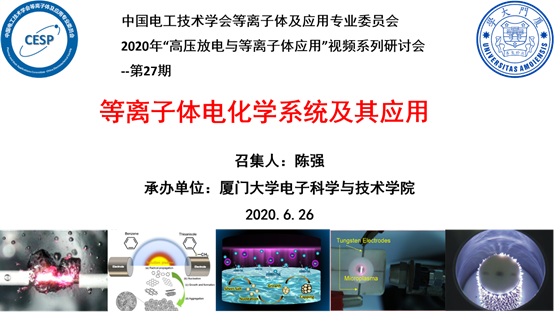 2020年6月26日下午14:00-17:00,由中国电工技术学会等离子体及应用专业委会主办的“高压放电与等离子体应用”系列视频研讨会(第27期)成功召开,会议主题为 “等离子体电化学系统及其应用”,由厦门大学承办。本次视频研讨会是在新冠肺炎疫情期间线下学术交流活动暂停的情况下组织召开的,采用腾讯会议和哔哩哔哩直播相结合的形式,得到了来自国内外高校及科研院所的专家和科研工作者的大力支持,共有100余人加入会议室交流。会议由厦门大学电子科学与技术学院陈强副教授主持。