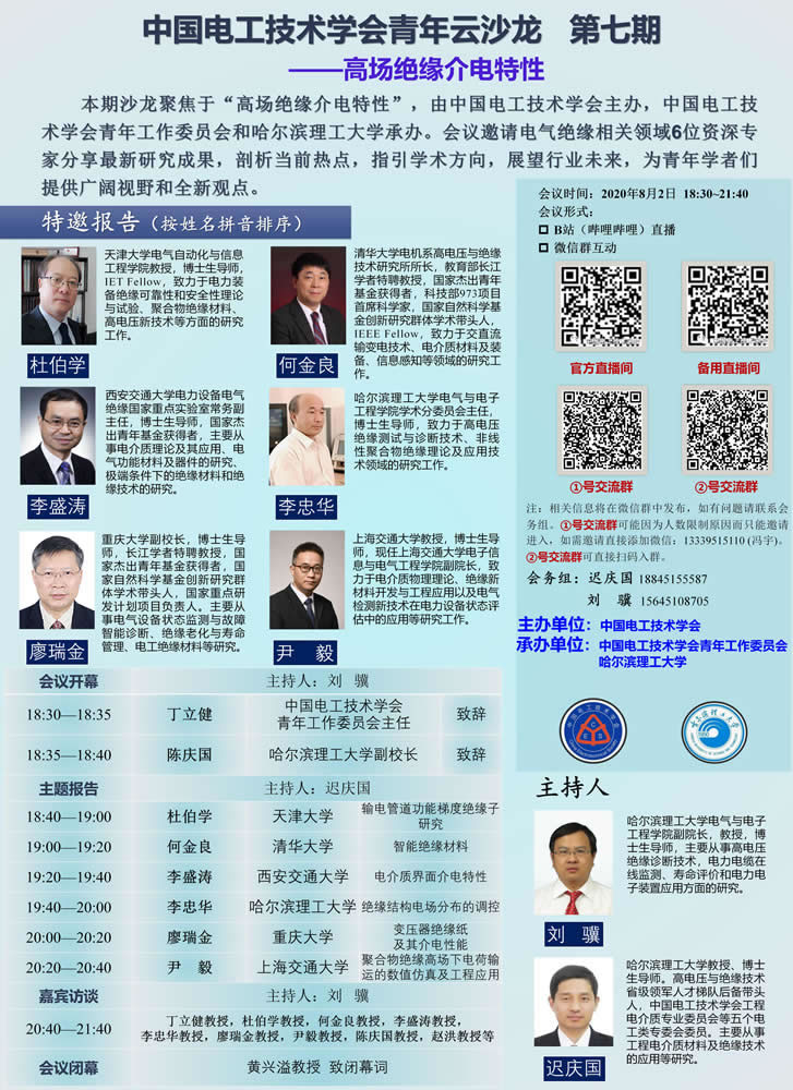 为加强本领域内专家学者的交流,碰撞学术思想,激发学术灵感,本期云沙龙聚焦“高场绝缘介电特性”,由中国电工技术学会主办,中国电工技术学会青年工作委员会和哈尔滨理工大学承办。会议采取资深学者讲堂模式,特邀高场绝缘介电特性研究领域的多位资深学者分享最新研究成果,介绍前沿发展动态,剖析瓶颈与挑战,还将对当下热点、行业未来、发展趋势等展开深度交流,为青年学者们的创新科研提供广阔视野和全新观点。