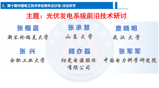 在资深专家访谈环节,加拿大张榴晨院士、山东大学张承慧教授、武汉大学查晓明副院长、合肥工业大学张兴教授、阳光电源股份有限公司顾亦磊副总裁和中国电力科学研究院张军军高工6位大咖针对光伏发电系统面临的挑战和前沿热点展开了热烈讨论。张榴晨院士介绍了光伏发电系统为电力系统运行提供的额外支持作用,并对年轻学者参与国际学会工作的方法提出了指导意见。张承慧教授探讨了1500V高压光伏发电系统的关键技术以及无变压器非隔离型光伏并网逆变器漏电流问题的解决方案。查晓明副院长就规模化光伏发电系统并网面对的挑战进行了阐述。张兴教授介绍了高比例电力电子化光伏发电系统的技术发展动向。顾亦磊副总裁分享了SiC器件在光伏逆变器上的前景并对平价上网后光伏逆变器发展方向给出了自己的看法。张军军高工就光储深度整合以及光伏与直流配电网的结合展开了探讨。各位访谈专家分别结合自身经验,讨论了光伏发电系统的核心技术和关键问题,并为广大青年学者继续深入研究指明了方向。