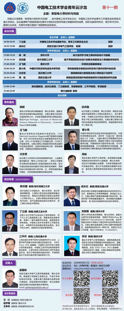 2020年9月27日下午18:50-22:05,与您相聚中国电工技术学会B站(哔哩哔哩)直播间和微信互动群。观看B站(哔哩哔哩)直播可扫描二维码或通过网址https://live.bilibili.com/22192289进入直播间。参与线上讨论和后续交流可扫描二维码进入微信交流群。为了惠及更多参会人员,请选择一个微信交流群加入即可。