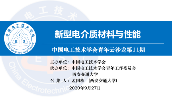 本期青年云沙龙聚焦“新型电介质材料与性能”,由中国电工技术学会主办,中国电工技术学会青年工作委员会和西安交通大学承办。中国电工技术学会副秘书长、学会青工委主任丁立健教授,西安交通大学电气工程学院成永红教授分别致欢迎辞。上海交通大学黄兴溢教授代表学会青工委致闭幕辞。本期活动召集人西安交通大学孟国栋副教授主持了云沙龙活动。