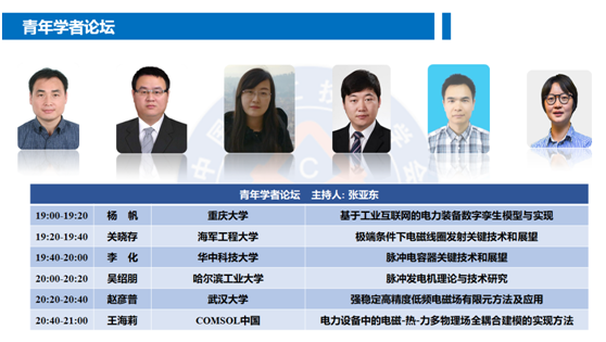 会议特邀了6位青年才俊,围绕多物理场技术及应用做了精彩的学术报告并回答了观众的问题。重庆大学扬帆教授介绍了基于工业互联网的电力装备数字孪生模型发展现状,对该领域多物理场计算模型降阶问题等核心技术问题进行了探讨;海军工程大学关晓存研究员对电磁线圈发射技术的多场耦合计算、电枢实时位置控制、电枢悬浮稳定性等关键问题研究现状进行了介绍,对线圈发射在极端条件下的科学问题进行了提炼和展望;华中科技大学李化教授介绍了脉冲电容器的材料和击穿场强发展现状,重点对击穿自愈、电容量损失、通流能力、低频极化等科学问题和关键技术进行了讨论,对机理研究和应用方向进行了展望;哈尔滨工业大学吴绍朋副教授介绍了脉冲发电机的理论与技术,分析了该领域的发展瓶颈,对未来主要的研究方向进行展望;武汉大学赵彦普教授介绍了强稳定高精度低频电磁场有限元方法及应用,讨论了电磁场数值计算在极端条件下的多场耦合面临的困难和解决思路;COMSOL公司王海莉博士介绍了COMSOL软件在电力设备中的电磁-热-力多物理场全耦合建模的实现方法。