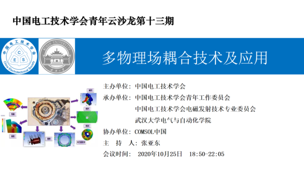 本期青年云沙龙聚焦“多物理场仿真技术及应用”,由中国电工技术学会主办,中国电工技术学会青年工作委员会、中国电工技术学会电磁发射专业委员会和武汉大学共同承办,COMSOL中国协办。中国电工技术学会韩毅秘书长和武汉大学电气与自动化学院唐炬院长分别致欢迎辞。中国电工技术学会青年工作委员会黄兴溢教授致闭幕词。本期活动由召集人武汉大学张亚东副研究员主持。