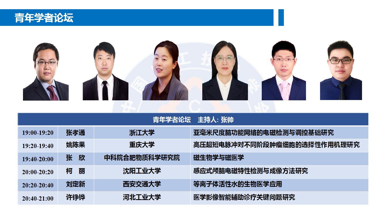 会议特邀了6位青年才俊,围绕生物电工前沿与热点做了精彩的学术报告并回答了观众的问题。浙江大学张孝通教授分享了脑功能网络亚毫米级电磁检测、成像与电磁神经调控以及多模态脑网络观测、追踪与调控等方面的最新研究成果。重庆大学姚陈果教授结合临床相关重大需求,介绍了高压超短电脉冲对不同阶段肿瘤细胞的选择性作用机理及协同免疫治疗创新研究思路。中国科学院合肥物质科学研究院张欣教授针对磁生物学与磁医学研究前沿与动态、结合强磁场实验大科学装置探讨了稳态磁场影响生物体的物理机制及其在肿瘤、糖尿病治疗方面的应用。沈阳工业大学柯丽教授介绍了磁感应电磁成像和磁粒子感应成像的原理、发展现状、系统设计及面向脑功能及脑科学的未来研究展望。西安交通大学刘定新教授介绍了等离子体活化水制备、等离子体活化水在消毒灭菌、在脓毒症、牛皮癣、癌症治疗等方面的最新研究进展及其在农业方面的应用。河北工业大学许铮铧教授结合医学影像辅助诊疗面临的问题和挑战,详细介绍了微小目标高精度学习、小数据学习和多模态融合学习等人工智能辅助诊断算法及应用等关键问题。