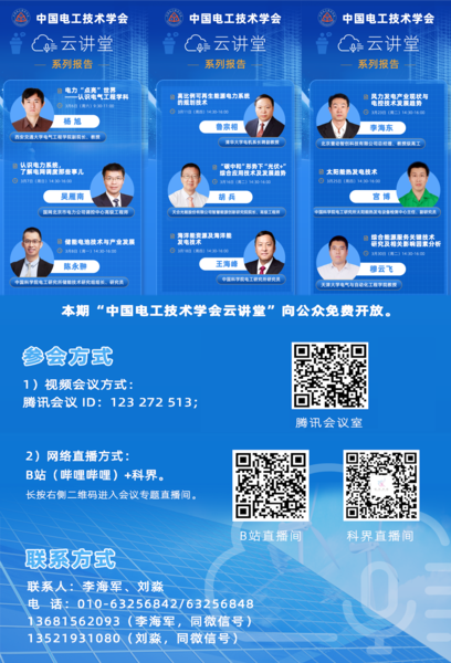 “中国电工技术学会云讲堂”后续报告精彩不断,各位专家围绕电气工程领域特别是能源互联网发展的热点问题陆续开讲:国网北京市电力公司调控中心吴雁南高级工程师《认识电力系统,了解电网调度那些事儿》、中国科学院电工研究所储能技术研究组组长陈永翀研究员《储能电池技术与产业发展》、清华大学电机系鲁宗相长聘副教授《高比例可再生能源电力系统的规划技术》、天合光能股份有限公司智慧能源创新研究院院长胡兵博士《“碳中和”形势下“光伏+”综合应用技术及发展趋势》、中国科学院电工研究所王海峰研究员《海洋能资源及海洋能发电技术》、北京雷动智创科技有限公司总经理李海东教授级高工《风力发电产业现状与电控技术发展趋势》、中国科学院电工研究所太阳能热发电设备检测中心主任宫博副研究员《太阳能热发电技术》、天津大学电气与自动化工程学院穆云飞教授《综合能源服务关键技术研究及相关影响因素分析》,欢迎各界人士积极参与。