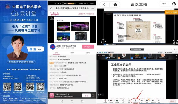 为最大限度地惠及更多听众,使在校师生及普通公众有机会享受“中国电工技术学会云讲堂”给予的“饕餮盛宴”,我会积极借助新媒体方式广泛宣传,采用腾讯会议+科界云平台+哔哩哔哩“中国电工技术学会直播间”,三路联动,同步直播。多家高校获取“云讲堂”信息之后,非常珍惜这次难得的学习交流机会,组织安排师生集体学习并积极互动,18000余人(腾讯视频会议380余人+科界9600余人+哔哩哔哩“中国电工技术学会直播间”8200余人)在线聆听并积极互动,个别高校还在“钉钉云课堂”上专门布置了学习任务并要求打卡考核,提交课堂笔记。报告结束后的互动环节尤为热烈,首场报告延时结束,好评如潮,收到了超出预期的社会效益,“云讲堂”首秀圆满成功。