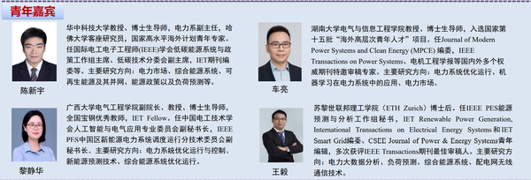 在专家访谈环节,河海大学鞠平教授、天津大学贾宏杰教授、华中科技大学文劲宇教授、东北电力大学严干贵教授、杭州电子科技大学曾平良教授等5位电工领域资深专家探讨了本领域的学术前沿动态与研究热点。专家们结合自身多年从事科学研究的经历,围绕“新能源电力系统源-网-荷-储协调运行”这一主题与青年学者进行了交流与互动,为青年学者指引学术方向,把握前沿动态,展望领域未来,激励青年学者担当奋进;河海大学鞠平教授首先简要介绍了广义负荷智能认知与高效调控的重要性,并分享了广义负荷智能认知与高效调控的整体研究框架以及主要的研究思路,并介绍了当前广义负荷研究的关键瓶颈和突破点;天津大学贾宏杰教授首先介绍了当前我国面临的巨大的减碳压力,并结合我国国情分析了我国实现双碳目标过程中存在的优势和劣势,详细介绍了综合能源系统相关技术和新型电力系统在我国实现双碳目标过程中起到的关键作用;华中科技大学文劲宇教授结合团队工作进展分享了大规模可再生能源并网消纳技术的最新研究成果,分享了他对未来直流输电发展的思考和建议,详细介绍了计算能源经济学的应用前景和潜力;东北电力大学严干贵教授分享了他对构建以新能源为主体的新型电力系统的看法,分析了高比例新能源和高比例电力电子化设备接入电力系统存在的难点,严干贵教授还详细介绍了东北电网新能源发展情况,介绍了未来中国新能源发展方向;杭州电子科技大学曾平良教授主要分享了双碳目标下电力系统面临的机遇与挑战,他简要介绍了双碳目标的实现途径和我国新能源资源分布情况,并从高比例新能源系统机制体制、系统构建、能源互联网、网络信息安全等方面分析了高比例新能源并网存在的技术挑战。