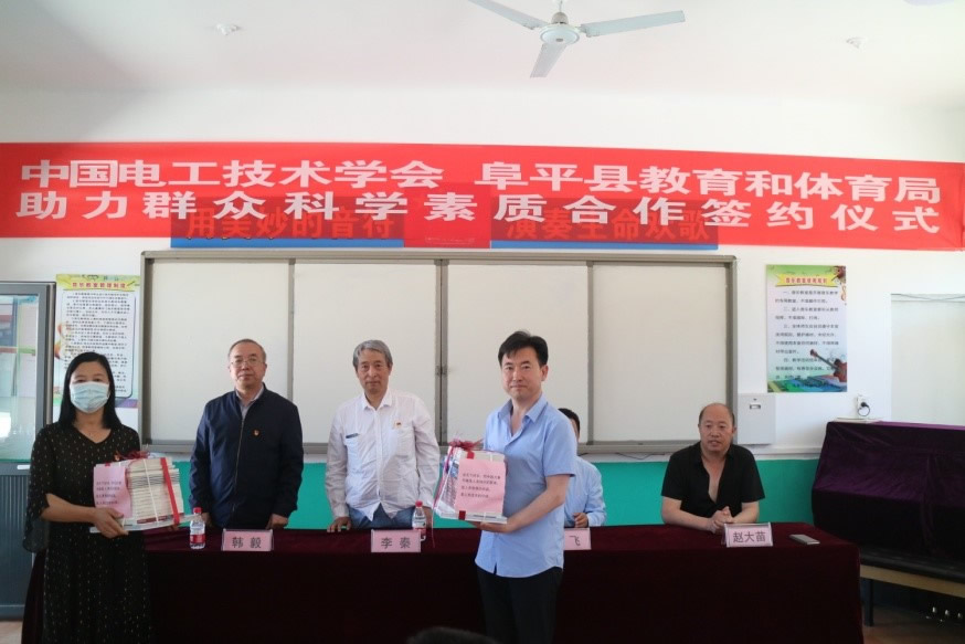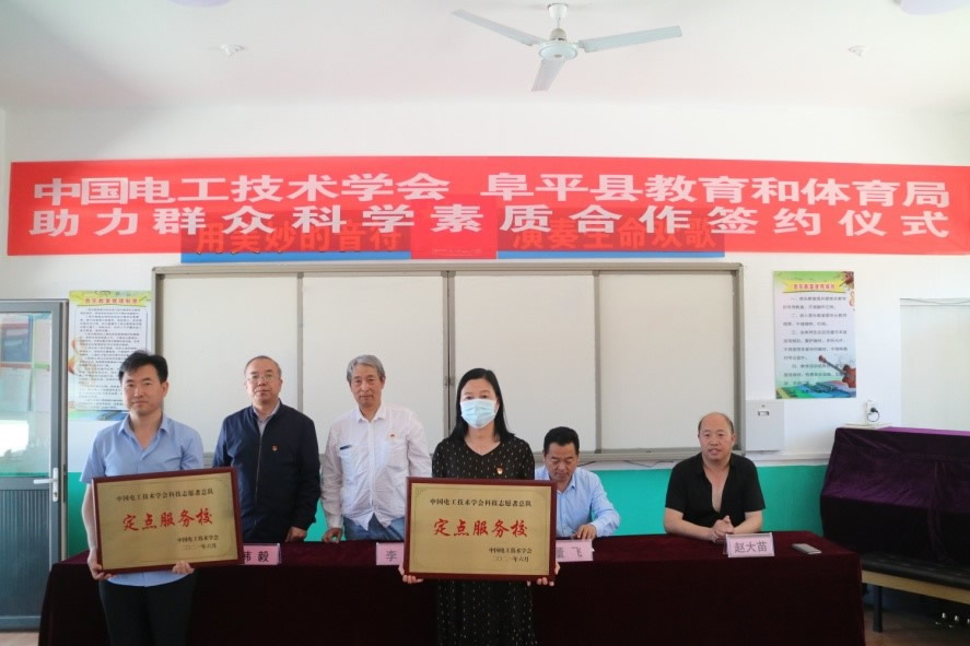 最后,学会领导向“中国电工技术学会科技志愿者总队定点服务校” 阜平县城厢中学和阜平县照旺台中心小学授牌,并捐赠青少年科普图书。