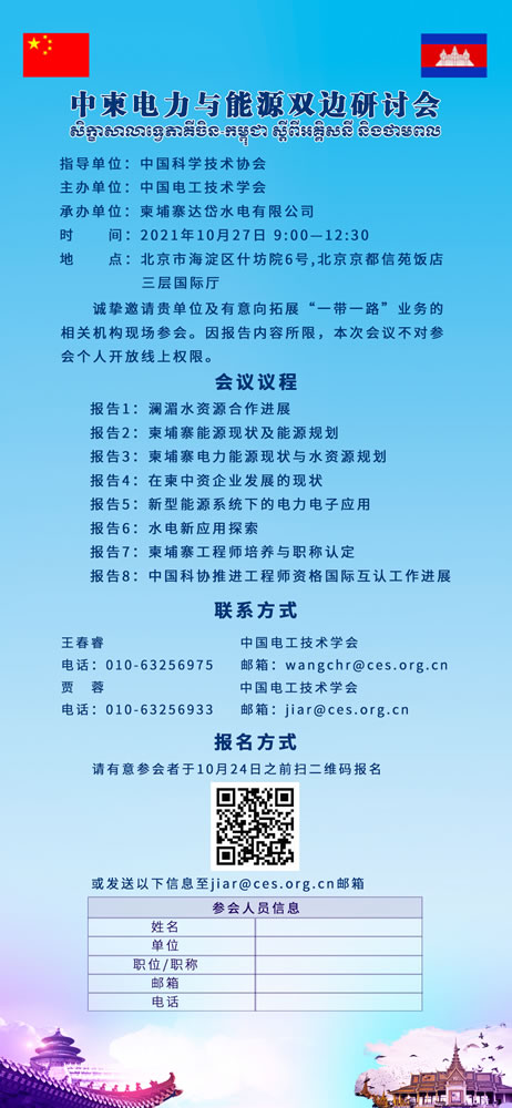 为贯彻“一带一路”倡议,加深中柬双方了解,共享“一带一路”成果,搭建有效的民间科技人文交流平台,由中国电工技术学会主办的“中柬电力与能源双边研讨会(China-Cambodia Bilateral Seminar on Power and Energy)”将于2021年10月27日在北京召开。