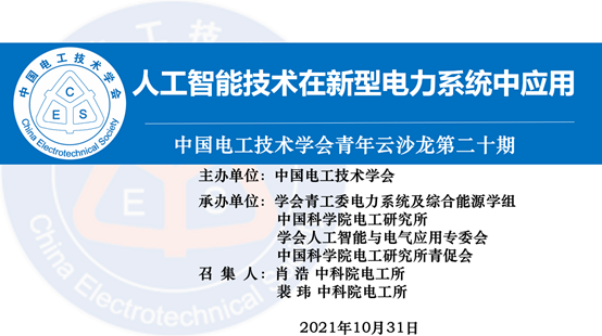 本期青年云沙龙聚焦“人工智能技术在新型电力系统中应用”,由中国电工技术学会主办,中国电工技术学会青年工作委员会、中国科学院电工研究所、中国电工技术学会人工智能与电气应用专委会和中国科学院电工研究所青年创新促进会共同承办。中国电工技术学会青年工作委员会主任丁立健教授,中国科学院电工研究所学术委员会主任孔力研究员致欢迎辞。学会青年工作委员会李勇教授主持开幕式,马静教授主持闭幕式。本期活动由召集人中国科学院电工研究所肖浩副研究员和中国科学院电工研究所裴玮研究员共同主持。