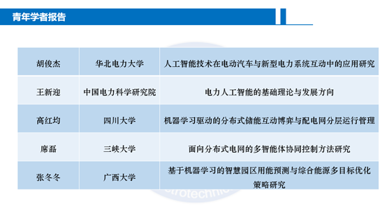 会议特邀了5位青年专家,围绕人工智能技术在新型电力系统中应用的前沿与热点做了精彩的学术报告,并回答了观众的问题。华北电力大学胡俊杰副教授分享了关于人工智能技术在电动汽车与新型电力系统互动中的应用研究的报告,提出了利用电动汽车多步灵活性与新型电力系统互动的人工智能优化策略方法。中国电科院人工智能所室王新迎主任分享了关于电力人工智能的基础理论与发展方向的报告,提出了人工智能研究中的几种主流学派的相关理论及其在电力系统中应用所需的关注点。四川大学高红均副教授分享了关于机器学习驱动的分布式储能互动博弈与配电网分层运行管理的报告,从分布式储能参与互动响应与配电网网络重构两个角度提出了机器学习方法在其中的建模与分析控制方法。三峡大学席磊教授分享了关于面向分布式电网的多智能体协同控制方法研究的报告,提出了基于狼爬山改进机器学习方法对大电网进行虚拟分割的优化策略。广西大学副张冬冬教授分享了关于基于机器学习的智慧园区用能预测与综合能源多目标优化策略研究的报告,提出了结合机器学习用能预测的二维需求响应方法来实现综合能源系统多目标运行优化。