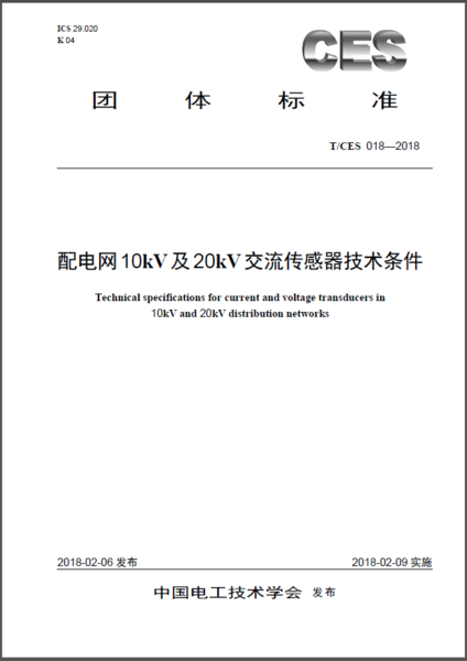 中国电工技术学会标准 T/CES 018-2018《配电网10 kV及20 kV交流传感器技术条件》由江苏省配用电与能效工程技术研究中心、中国电力科学研究院、国网电力科学研究院、国电南瑞科技股份有限公司、许继集团有限公司、江苏省电力科学研究院、上海置信电气股份有限公司、天津平高智能电气有限公司、浙江华采科技有限公司、北京瑞奇恩互感器设备有限公司、大连第一互感器有限公司、中能国研(北京)电力科学研究院等单位共同起草编制。