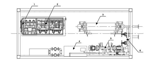 感应加热型集中电供热装置由控制系统、电源、加热体、循环系统、过滤系统、定压补水系统、测量系统组成,各组成单元在集装箱内部的布置如图1所示: