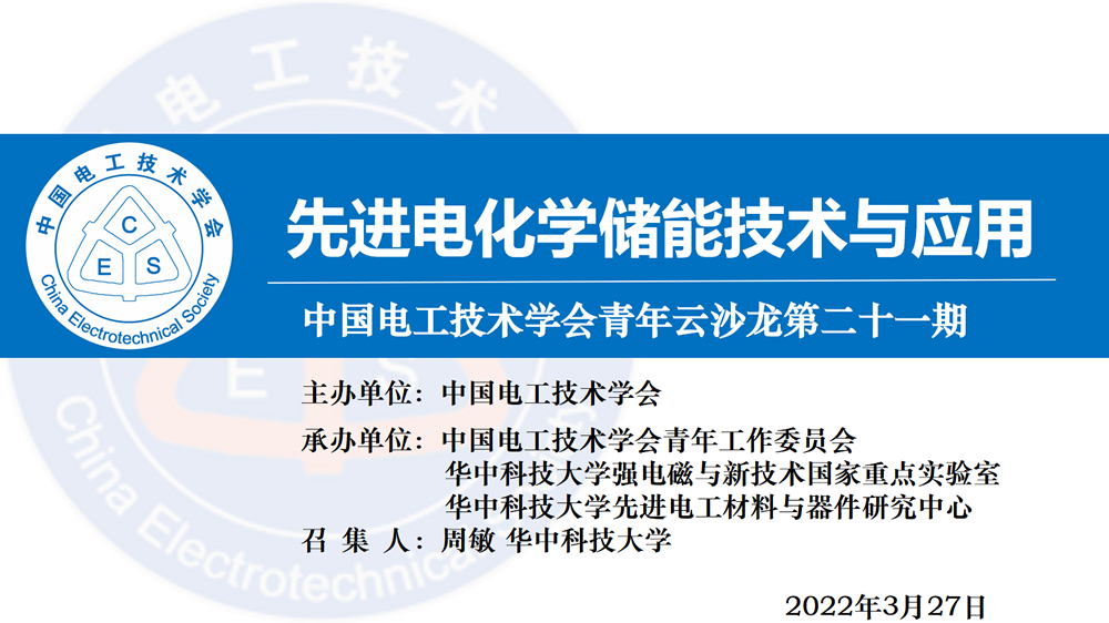 本期云沙龙主题为“新型电化学储能技术与应用”,主要聚焦于面向电力应用的电化学储能系统构建中的关键挑战,由中国电工技术学会青年工作委员会、华中科技大学强电磁工程与新技术国家重点实验室、华中科技大学先进电工材料与器件研究中心共同承办。学会青工委主任丁立健教授和华中科技大学电气与电子工程学院院长文劲宇教授致欢迎辞。中国电工技术学会青年工作委员会先进储能技术与应用主任熊瑞教授、王凯教授分别主持开、闭幕式。本期活动由召集人华中科技大学周敏副教授、王康丽教授主持。