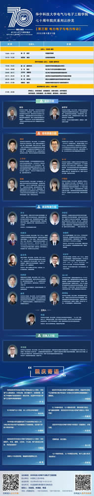 2022年华中科技大学电气与电子工程学院将喜迎建院(系)70周年华诞。自2022年2月开始,华中科技大学电气与电子工程学院联合中国电工技术学会举办《华中科技大学电气与电子工程学院七十周年院庆系列云沙龙》活动,共同讲述华中大电气的学科发展和学术进展故事。