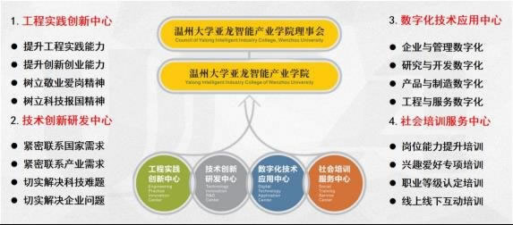 产业学院设有工程实践创新中心、技术创新研发中心、数字化技术应用中心、社会培训服务中心四大中心,主要围绕提升学生、企业工程技术人员的工程实践和创新创业能力,树立敬业爱岗和科技报国精神;紧密联系国家和产业需求,切实解决科技难题和企业问题;推动企业与管理数字化、研究与开发数字化、产品与制造数字化、工程与服务数字化;开展岗位能力提升培训、兴趣爱好专项培训、职业等级认定培训、线上线下互动培训。