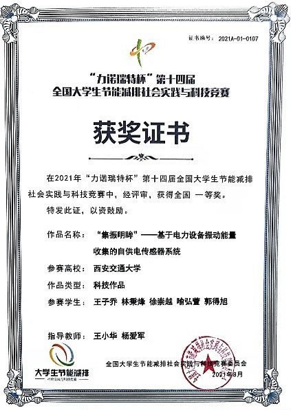 全国大学生节能减排社会实践与科技竞赛获奖证书