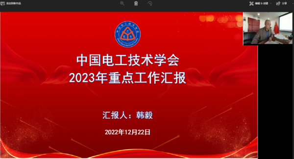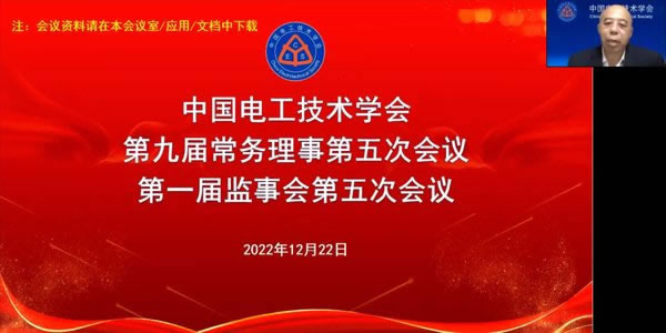 2022年12月22日,中国电工技术学会第九届常务理事会第五次会议及第一届监事会第五次会议以线上会议方式成功召开,学会党委书记、理事长杨庆新主持会议。副理事长孙逢春、张文亮、徐殿国、贾利民、宋永华、曾嵘、荣命哲、李耀华、尹天文、管瑞良,汤广福院士、丁荣军院士、王秋良院士、饶宏院士等55位常务理事,监事长郝玉成,秘书长韩毅,监事会监事孙鹤旭、刘杰、姚为正等参加会议。副秘书长及工作总部各部门负责人列席会议。