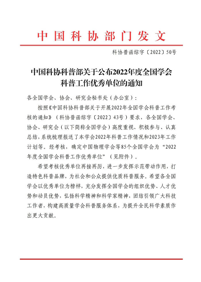 中国科协“全国学会科普工作优秀单位”表彰通知
