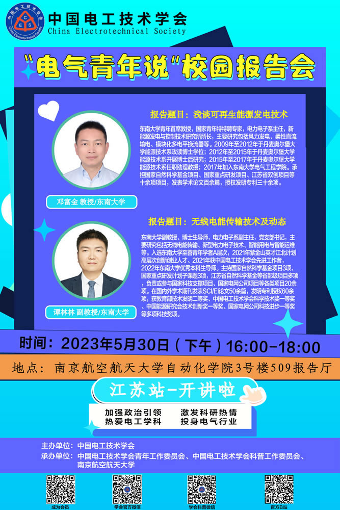 2023年 “电气青年说”校园科普报告会·江苏站首场活动将于5月30日在南京航空航天大学自动化学院举办,精彩内容,敬请期待。