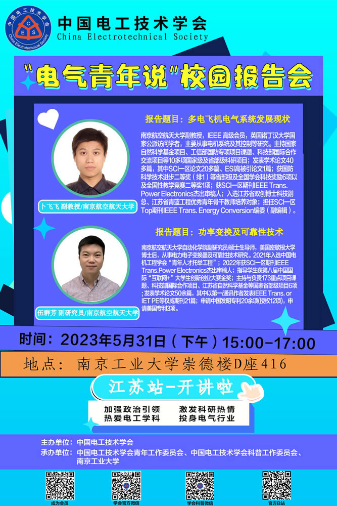 2023年 “电气青年说”校园科普报告会·江苏站将于5月31日在南京工业大学崇德楼举办,精彩内容,敬请期待。