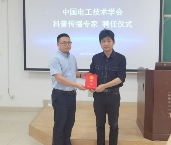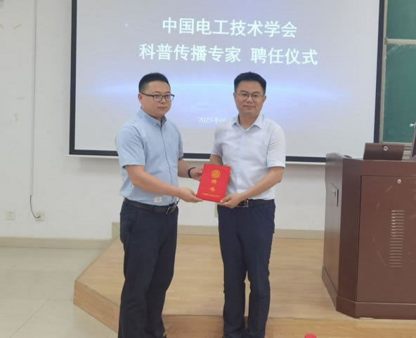 颁发中国电工技术学会“科普传播专家”证书(左为张犁,右为王楚扬)