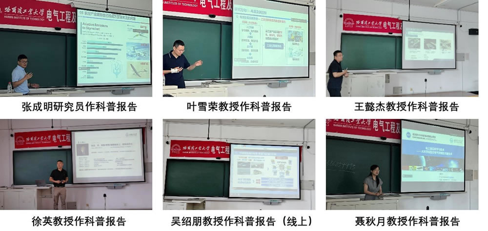 张成明研究员以“空中交通—未来电动智能飞行器”为题,讲述了电动飞行器的国内外发展现状以及发展电动飞行技术在实现国家双碳战略中的重要性,并结合自身科研方向,介绍了高效率电机在飞行器电推进系统中的应用。叶雪荣教授以“电器与电子可靠性研究,助力制造强国和质量强国”为题,讲解了电器与电子可靠性的相关基础知识,重点介绍了建立完备的电子元件模型库对于建设制造强国的重要意义。王懿杰教授以“高距径比无线电能传输技术”为题,介绍了松耦合变压器寄生电容的作用机制,分析了串联谐振在实现高效率远距离无线电能传输中的有效性,并对未来无线电网的建设进行了展望。徐英教授以“可再生能源与电网”为题,重点介绍了目前可再生能源领域亟需突破的实用化大容量储能技术、高效率可再生能源电源技术以及可再生能源电网调度运行技术等关键问题。吴绍朋教授以“惯性储能电源技术”为题,从毫秒级、秒级以及分钟级三个维度介绍了惯性储能技术的原理、研究进展及其在电力、轨道交通等方面的应用。聂秋月教授以“电工前沿科学与技术——大科学装置在电气领域的关键技术”为题,科普了电工理论及技术与国家大科学工程的交叉融合,并以零磁系统和等离子体系统为例,重点介绍了哈尔滨工业大学主持的大科学工程——空间环境地面模拟装置的最新进展。