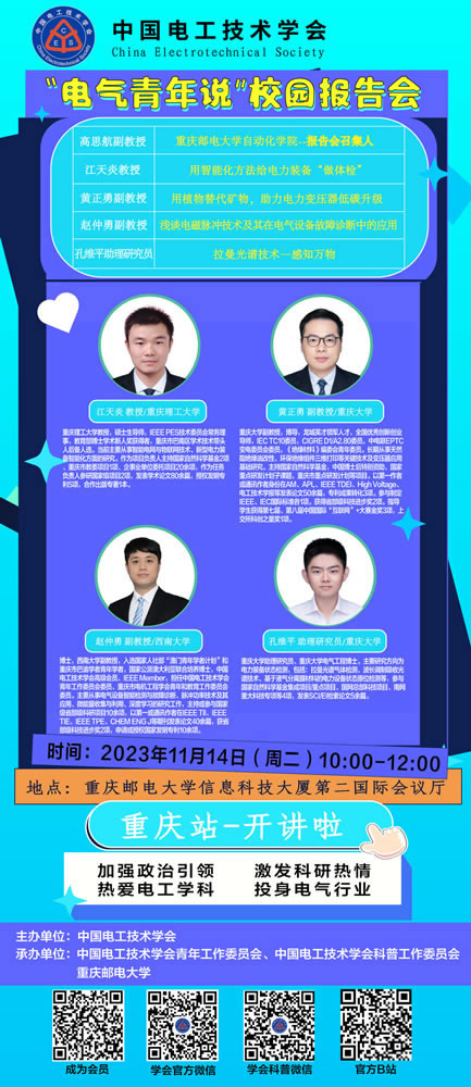 2023年 “电气青年说”校园科普报告会·重庆站将于11月14日在重庆邮电大学信息科技大厦第二国际会议厅举办,精彩内容,敬请期待。