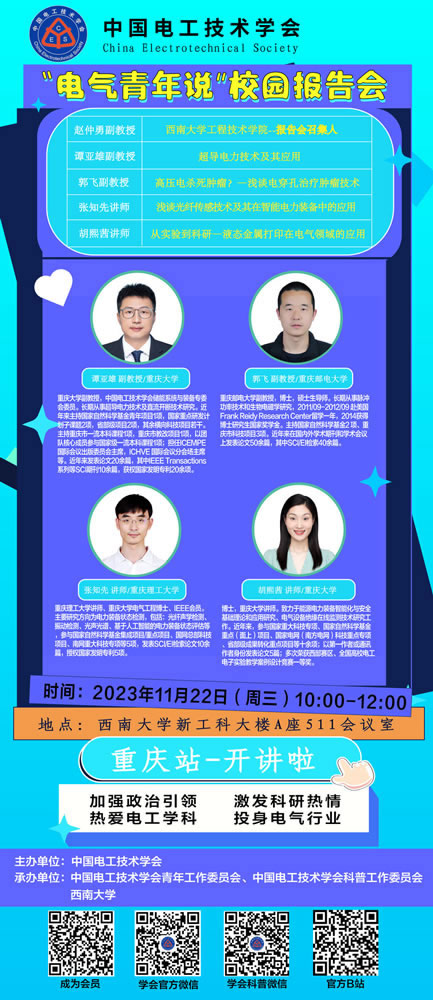 2023年 “电气青年说”校园科普报告会·重庆站将于11月22日在西南大学新工科大楼A座511会议室举办,精彩内容,敬请期待。