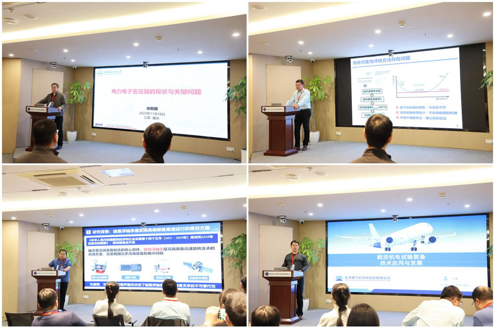 徐殿国教授以“电力电子变压器的现状与关键问题”为题,从电力电子变压器原理、应用场景、关键技术及问题等方面做了详细介绍,指出需要突破的技术方向和研究路径。马柯长聘副教授以“电力电子工况模拟测试技术及应用”为题,分析可靠性测评的现状及问题,提出基于工况模拟及可靠性测试的三相变流器、级联变流器测试系统及其关键支撑技术,展现了广阔应用前景。蒋栋教授以“高性能磁悬浮轴承控制系统关键技术研究”为题,揭示研究磁悬浮轴承控制系统关键部件的故障失效机理-诊断-容错控制技术,以及磁悬浮轴承电磁干扰和机械干扰机理和主动抑制技术, 是突破磁悬浮轴承控制系统可靠性和抗扰性的瓶颈。吴健教高以“航空机电试验装备技术应用与发展”为题,围绕航空机电试验装备技术和天津电气科学研究院重点业务板块,从相关技术应用、关键技术与未来展望等方面做了详细介绍。