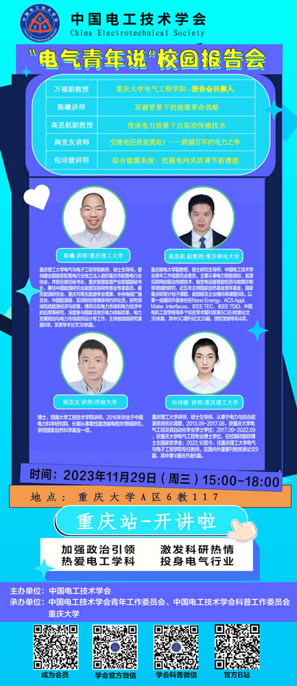 2023年 “电气青年说”校园科普报告会·重庆站将于11月29日在重庆大学A区6教117教室举办,精彩内容,敬请期待。