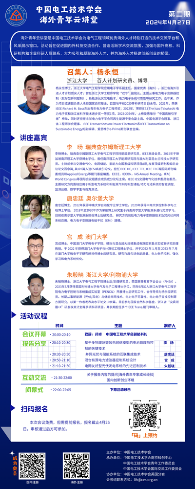 海外青年云讲堂是中国电工技术学会为电气工程领域优秀海外人才特别打造的技术交流平台和风采展示窗口。活动旨在促进国内外科技交流合作、营造活跃学术交流氛围,加强与国外高校、科研机构和企业科研人员联系,大力吸引和凝聚海外人才,并为海外人才搭建创新创业的桥梁。
