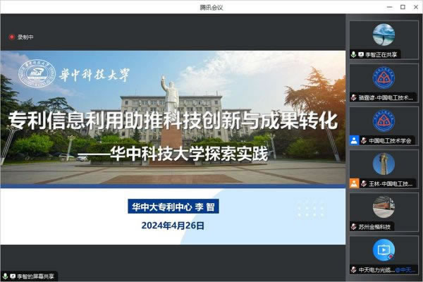在第24个世界知识产权日来临之际,为加强知识产权保护和运用宣传普及,全面全面提升科技工作者尊重和保护知识产权意识,4月26日上午,我会特邀华中科技大学专利中心李智主任以视频会议方式做题为“专利信息利用助推科技创新与成果转化”的讲座,学会会员、理事单位及团体会员单位代表、学会系统专业委员会及省市学会代表等近200人线上参会。
