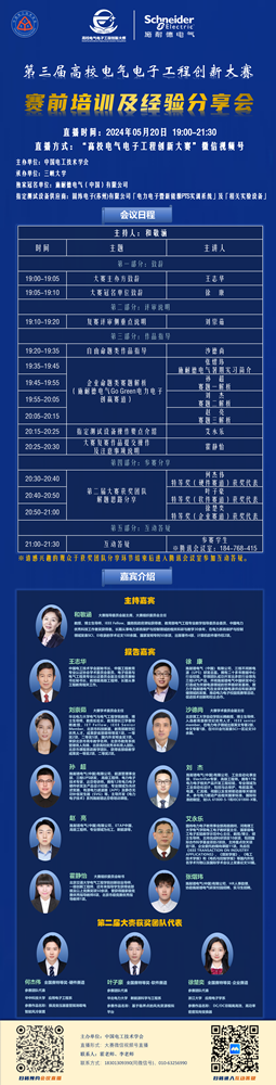 第三届高校电气电子工程创新大赛赛前培训及经验分享会将于2024年05月20日(周一)19:00-21:30线上直播,会议邀请专家解析赛题,往届获奖团队分享参赛经验,并与大家答疑互动。详细议程见下方海报。 诚挚邀请各参赛选手以及对大赛感兴趣的广大师生参加! 注:答疑互动环节可采用直播评论留言或腾讯会议间发言的方式。