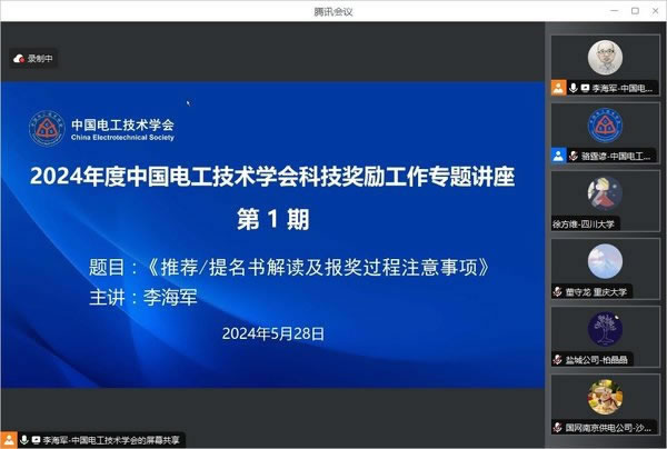 中国电工技术学会科学技术奖紧密结合电气工程学科发展、科技进步和产业创新需求,在激励人才成长、激发自主创新、促进成果转化、推动科技进步方面发挥了重要作用。为帮助各理事单位、团体会员单位了解我会科技奖励工作相关要求,提高报奖材料质量,我会于2024年5月28日上午采用视频会议与网络直播相结合的方式成功举办2024年度中国电工技术学会科技奖励工作专题讲座(第1期)。本期讲座主题为《推荐/提名书解读及报奖过程注意事项》,由我会咨询部业务主管李海军主讲。讲座吸引了来自高等院校、科研院所和企业的900余位电气工程领域科技工作者参会交流。清华大学、上海交通大学、重庆大学、平高集团、西安西电高压开关有限责任公司、国网南京供电公司、广东电网有限责任公司、北京智芯微电子科技有限公司等单位特别组织了集体学习。