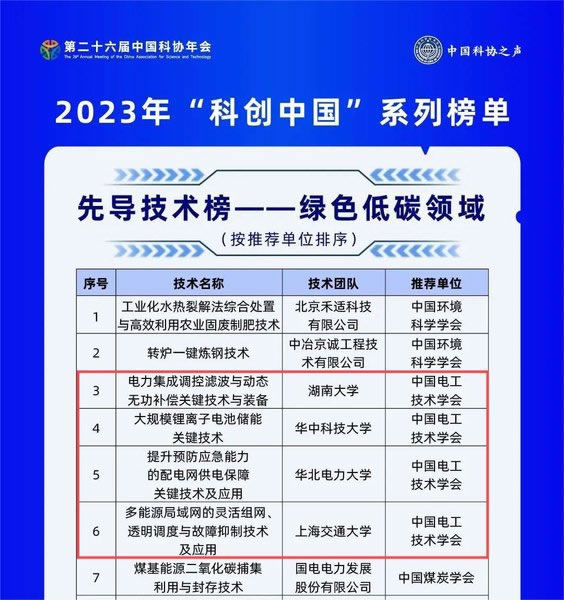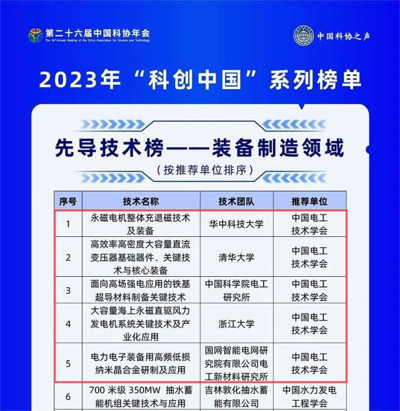 我会推荐的湖南大学“电力集成调控滤波与动态无功补偿关键技术与装备”、华中科技大学“大规模锂离子电池储能关键技术”、华北电力大学“提升预防应急能力的配电网供电保障关键技术及应用”、上海交通大学“多能源局域网的灵活组网、透明调度与故障抑制技术及应用”、华中科技大学“永磁电机整体充退磁技术及装备”、国网智能电网研究院有限公司电工新材料研究所“电力电子装备用高频低损纳米晶合金研制及应用”、中国科学院电工研究所“面向高场强电应用的铁基超导材料制备关键技术”、清华大学“高效率高密度大容量直流变压器基础器件、关键技术与核心装备”、浙江大学“大容量海上永磁直驱风力发电机系统关键技术及产业化应用”共9项成果成功入选2023年“科创中国”先导技术榜单,连续两年成为推荐成功率最高的全国学会。