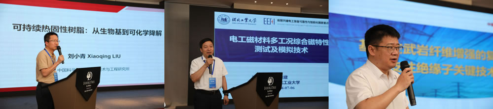会议邀请到中国科学院宁波材料所国家高层次领军人才刘小青研究员、河北工业大学电气工程学院党委书记李永建教授、华北电力大学副校长刘云鹏教授作资深专家主旨报告。刘小青研究员以“可持续热固性树脂研究——从生物基到可化学降解回收”为题,介绍了可持续热固性树脂的研究进展及应用前景;李永建教授以“电工磁材料多工况综合磁特性测试及模拟技术”为题,介绍了“双碳”背景下电工装备电磁特性研究进展;刘云鹏教授以“基于玄武岩纤维增强的复合横担和支柱绝缘子关键技术研究”为题,分享了玄武岩纤维增强复合材料技术应用背景及轻质高绝缘芯体的设计思路和应用前景。