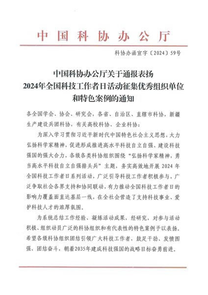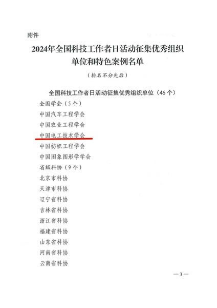 2024年8月25日,中国科协通报表扬2024年全国科技工作日活动征集优秀组织单位和特色案例,中国电工技术学学会获得“全国科技工作者日活动征集优秀组织单位”,本年度共有5家全国学会获优秀组织单位。 感谢全体会员及广大科技工作者一直以来对学会工作的支持。学会将再接再厉,继续发挥学会的组织优势和人才优势,服务好本领域的广大科技工作者,为电气工程学科的发展作出更大的贡献。