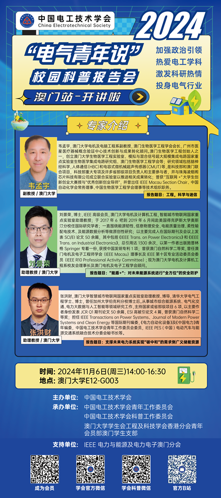 中国电工技术学会“电气青年说”第二场校园科普报告会澳门站将于2024年11月6日在澳门大学E12-G003举办,精彩内容,敬请期待。