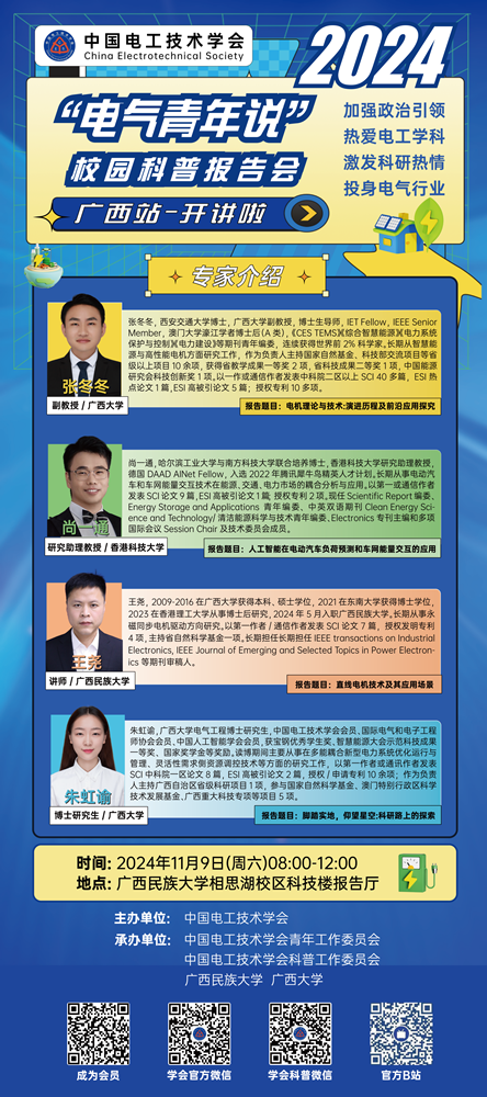 中国电工技术学会“电气青年说”第三场校园科普报告会广西站将于2024年11月9日在广西民族大学相思湖校区科技楼报告厅举办,精彩内容,敬请期待。