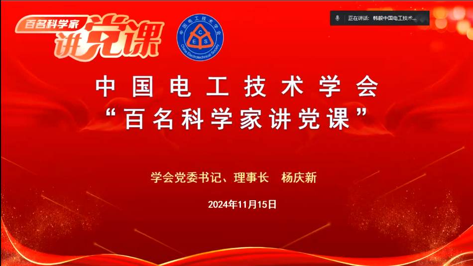 11月15日,中国电工技术学会举办“百名科学家讲党课”报告会。学会理事会党委书记、理事长杨庆新以“学习党的二十届三中全会精神和参加全国学会党组织负责人国情研修班体会”为主题作辅导报告。学会党委委员、党支部书记、秘书长韩毅主持报告会。