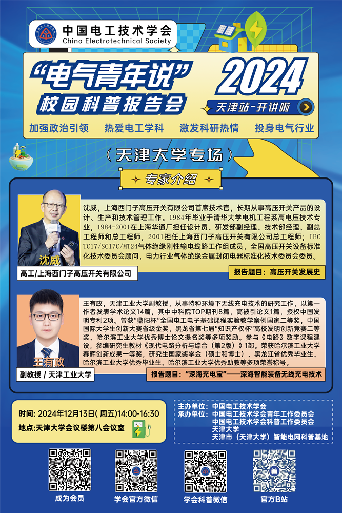 为加强对青年学生的政治引领,激发学习和科研热情,引导青年学生热爱电工学科、未来投身电气行业,中国电工技术学会特面向电气工程及相关专业在校大学生组织“电气青年说”校园科普报告会。